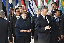 After attending his first European Council summit on 20 October 2016, in an address to the Croatian Parliament, Plenković said that "there is no need for Croatia to build border fences".[44] Plenković's first official foreign visit was to Sarajevo, Bosnia and Herzegovina on 28 October 2016. Plenković said that his government will support Bosnia and Herzegovina on its path towards membership in the European Union. Discussions were held regarding the political rights of Bosnian Croats, mostly in terms of bringing their political rights to the level enjoyed by Bosniaks and Bosnian Serbs.[44][45] In November, he visited Ukraine where he met with Prime Minister Volodymyr Groysman. Plenković expressed support for a peaceful reintegration of the areas of Ukraine under the control of pro-Russian rebels. The two governments established a working group to share Croatia's experience with the reintegration of eastern Slavonia in 1998.[46] The Russian Ministry of Foreign Affairs commented that the visit "raised serious concerns in Russia".[47]