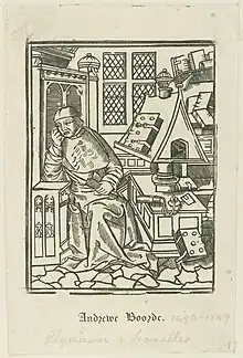 He finally settled at Montpellier and before 1542 had completed his Fyrst Boke of the Introduction of Knowledge, which ranks as the earliest continental guidebook, his Dietary and his Brevyary. He probably returned to England in 1542, and lived at Winchester and perhaps at Pevensey. John Ponet, bishop of Winchester, in an Apology against Bishop Gardiner, relates as matter of common knowledge that in 1547 Doctor Boord, a physician and a holy man, who still kept the Carthusian rules of fasting and wearing a hair shirt, was convicted in Winchester of keeping in his house three loose women. For this offence, apparently, he was imprisoned in the Fleet, where he made his will on 9 April 1549. It was proved on the 25th of the same month. Thomas Hearne (Benedictus Abbas, i. p. 52) says that he went round like a quack doctor to country fairs, and therefore rashly supposed him to have been the original Merry Andrew.[1]