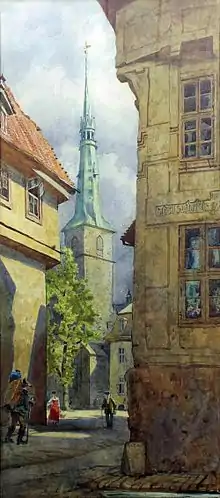 The Donaldsons retired to the New Forest in Hampshire in later life, settling in the village of Lyndhurst where they lived in a house called Woodhay. Agnes Emily Donaldson died there in 1918, followed by Andrew Brown Donaldson in 1919. During his lifetime his works were exhibited by the Royal Academy and the Society of Painters (now the Royal Watercolour Society), as well as at numerous other provincial exhibitions. Today, examples of his work can be seen at various public galleries and institutions, most notably Tate Britain (see below), the Palace of Westminster[3] and New College, Oxford,[4] as well as at the Guildhall in Winchester[5] and the Usher Gallery in Lincoln.[6] The Tate's painting is a watercolour of the famous bridge - Puente de San Martín - in the ancient Spanish city of Toledo, painted by Donaldson in 1889 and gifted to the gallery in 1899 by his wife's aunt, the social reformer Louisa Twining.[7]