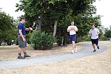 US Navy 090804-N-5366K-094 Chief Special Warfare Operator (SEAL) Jason Torey keeps time as KNDD radio station host Andrew Harms, right, runs 1.5 miles to practice for the Navy SEAL Fitness Challenge at Surrey Downs Park