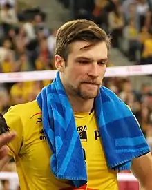 He was first appointed to the Polish national team by Andrea Anastasi in 2012.[6] He debuted in a Poland – Serbia friendly match. He played in the Polish national team at World League 2013. On September 21, 2014 won a title of World Champion 2014.[7][8][9] On October 27, 2014 received a state award granted by the Polish President Bronisław Komorowski – Gold Cross of Merit for outstanding sports achievements and worldwide promotion of Poland.[10]