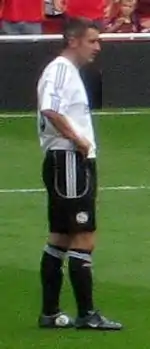 Griffin settled quickly in Newcastle and earned call-ups to the England U21 team and also played in the 1999 FA Cup Final.[5] However, he picked up an injury in August 1999 ruling him out for the 1999–2000 season but made a comeback the following season but he again suffered a hernia injury missing another season.[6] Griffin enjoyed something of a resurgence under Bobby Robson and made several solid performances during the 2002–03 season, including in the UEFA Champions League, when his winning goal against Juventus rekindled his side's campaign.[7][8] Injuries and a failure to get a regular place in the side saw him not offered a new contract by Newcastle at the end of the 2003–04 season.[9]