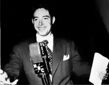 As a child, he loved listening to American popular music and Big Band, such as Benny Goodman, Glenn Miller and Tommy Dorsey. He idolized crooners Dick Powell, Bing Crosby and Jack Leonard.[3][17][18] He went wild over popular music, knew all the hit tunes, and was the neighborhood authority on every name band leader in the country.[19] While attending school, he also worked as a newspaper vendor at a corner in downtown L.A.[20]
