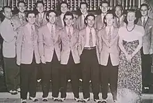 Russell performed as bilingual vocalist and swing drummer with Arnheim for 4 years.[31] During this period, he received offers from Paul Whiteman, Jimmy Dorsey, Glenn Miller, Charlie Spivak,[31] and such bands as Johnny Richards, Sonny Dunham, Alvino Rey and Vido Musso.[21] Russell's popularity grew to the point that acclaimed band leader Tommy Dorsey made him a lucrative offer to play only the drums, as he already had a singer, a young Frank Sinatra. Russell declined because "he decided he could make more of a name if he concentrated on his singing,"[19][39] so he chose to join Alvino Rey.[31] Some of the venues in the Los Angeles area where he played were the Cocoanut Grove at the Ambassador Hotel on Wilshire Boulevard, the old Follies Theater on Main Street,[7][40] the Orpheum Theater on Broadway,[41] the Santa Monica Pier,[42] and Joe Zucca's Show Case in Hermosa Beach.[21]