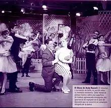 Later, Russell began to appear in the new medium of television in the early 1950s on Your Show of Shows with Sid Caesar on NBC, but continued to record, though less frequently. From December 1950 to June 1951, he appeared with his wife on the ABC-TV show Andy and Della Russell.[81] "It was a brief but pleasant musical interlude, which originated live from New York [from 7:00 to 7:05] every weeknight."[82] They also had an act that they would perform together in nightclubs. A review described their act as: "delightfully light, cleverly done and wholly entertaining."[83] In addition to singing and dancing, Russell would perform impressions of celebrities. Lastly, they appeared together in the musical short, House Party (1953).