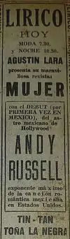 At this point, Russell began to look elsewhere for a place to perform. On 16 October 1953, he made his debut in Mexico City at the Teatro Lírico alongside such legendary performers as Agustín Lara, Tin Tan, Toña la Negra, and others.[85] He was billed as "the Mexican star of Hollywood and the greatest exponent of romantic Mexican song in the United States".[85]