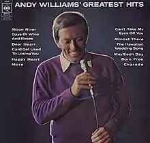 Andy Williams' Greatest Hits is a compilation album by American pop singer Andy Williams that was released in early 1970 by Columbia Records.[5] It was not, however, as its title might suggest, strictly a hit singles compilation, although some of his biggest songs since joining Columbia (such as the easy listening number ones "Can't Get Used to Losing You" and "Happy Heart") were included. A couple of selections ("Born Free" and "More") were never released as singles by Williams, and his signature song, "Moon River", was released in the 7-inch single format but only for jukeboxes.[6] His six Cadence singles that made the Top 10 on Billboard magazine's Hot 100 are passed over for the inclusion of his number 11 hit from that label, "The Hawaiian Wedding Song", and 17 of his Columbia recordings that made the Hot 100 up until 1970 are left out here in favor of "Charade", which spent its one week on the chart at number 100.[7]