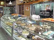 Angel's Bakery opened its landmark factory store adjacent to the Givat Shaul plant in 1984.[2] The store offers a full selection of packaged breads, rolls, and muffins, bourekas, danishes, fancy cakes, handmade pastries, coffee and soft drinks. For many years, visitors could watch bakers braid challot through a large side window. At the end of the Passover holiday, a long line of customers traditionally forms outside the store after midnight, waiting to buy the first bread off the production line.[14][15]