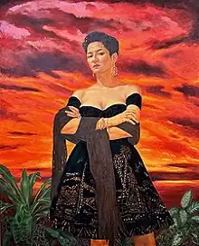 While he was unemployed, Rodriguez-Diaz participated in solo exhibitions at the Zolla/Lieberman Gallery in Chicago and Mendelson Gallery in Pittsburgh. His next job was working as an accountant, where he stayed for a year before being laid off. The free time allowed him to work in his own studio in Brooklyn, which he rented for a few years. After moving back to Manhattan, Rodriguez-Diaz began to paint more portraits, including The Protagonist of an Endless Story, which depicts Sandra Cisneros and now hangs in the Smithsonian American Art Museum (SAAM) after hanging for years in Cisnero's home.[1][2][4] According to the SAAM, "Cisneros stands before a fiery sunset, dressed in a traditional Mexican skirt embroidered with sequined imagery that refers to her profession as a writer. Her commanding pose, reminiscent of historic European portraiture, proclaims that she will endure in her native landscape."[5]