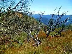 Much of this National Forest is covered with dense chaparral shrub forests with oak woodlands, which changes to pine and fir-covered slopes in the higher elevations. Subsequent to the fire there was a heavy growth of poodle-dog bush, apparently triggered by the fire's effect on dormant seeds, that lasted for several years. The plant produces prolific lavender flowers. Unfortunately, as visitors to the Forest discovered, contact with it may cause a poison-oak-like rash.