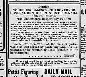 Once the story hit the newspapers, however, a media frenzy began—not just in Sault Ste. Marie, but especially in the United States[6] and even Europe.[2][3][5] Though some of the coverage was negative, arguing from racist stereotypes that Napolitano, as an Italian, was a "hot-blooded foreigner" and deserved to pay the penalty for her crime,[2] most of it revolved around those sympathetic to the abuse she had suffered, and agitating for her sentence to be commuted to jail time or even a pardon.[2] The federal minister of justice, Sir Allen Bristol Aylesworth, received many letters from individuals (including McFadden),[2] as well as petitions organized by groups in Sault Ste Marie, Toronto, New York City, Chicago, England, Austria, and Poland.[2] A doctor in Ohio, Dr. Alexander Aalto, even offered to be hanged in Angelina's place, saying: "It would only be fair to Mrs. Napolitano for a man to give his life for her, inasmuch as her life is in peril on account of a man's persecution of her, and because men condemned her."[8]