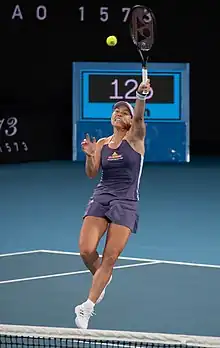 At the start of the 2017 season, Kerber competed at the Brisbane International as the top seed, and won her opening match against Ashleigh Barty in three sets but then lost to Elina Svitolina in the quarterfinals.[147][148] The following week in Sydney, she dropped opening match to Daria Kasatkina.[149] As the top-seeded player and defending champion at the Australian Open, Kerber overcame a mid-match lapse to see off Lesia Tsurenko in the first round, where she squandered a match point in the second set.[150] Kerber then defeated compatriot Carina Witthöft in the second round and Kristýna Plíšková in the third round. In the fourth round, Kerber lost to eventual semifinalist CoCo Vandeweghe in straight sets.[151] Serena Williams, who lost to Kerber in the championship match here 12 months ago, won the tournament this time and amassed enough points to take back the top ranking from Kerber.[6]