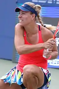 After Wimbledon, Kerber played at the Swedish Open where she withdrew before her second round match due to an injury.[131] She then reached her first quarterfinal at the Canadian Open with three-set wins over Mirjana Lučić-Baroni and Svitolina.[132] She then beat Daria Kasatkina to make the last four when lost to eventual champion Halep.[133] At the Olympics, Kerber defeated Mariana Duque Mariño, Eugenie Bouchard, Samantha Stosur to record her second Olympic quarterfinal appearance. Two more wins, over Konta and Madison Keys, saw Kerber book her spot in the gold medal match, where she was defeated by surprise finalist Monica Puig of Puerto Rico in three sets.[134][135][136] Kerber's strong summer continued at the Cincinnati Open where she had her first opportunity to dethrone Serena Williams as the world No. 1 but needs to win the title to do so. Kerber did make the final where she faced 15th seed Karolína Plíšková but lost in straight sets.[137] Nevertheless, Kerber's strong results throughout the year thus far ensured herself qualification for the WTA Finals, which was announced on 22 August following the conclusion of the Cincinnati tournament.[138]