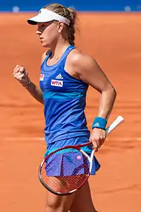 Kerber was unseeded in Stuttgart to open her season on red clay, and defeated Alexa Glatch in straight sets, before upsetting three-time defending champion Maria Sharapova in three sets.[96] In the quarterfinals, she saw off Ekaterina Makarova, before beating Madison Brengle to reach her second final of the year. There, she fought back from a set and 5–3 down to prevail over Caroline Wozniacki, thus scoring her fifth career title, also her first on home soil, which saw her extend her winning streak on clay to 11 matches.[97] That streak, however, expired in the hands of Stosur in the opening round of Madrid. At the Italian Open, Kerber reached the second round after defeating Alizé Cornet but lost to Begu once more. After a semifinal run in Nuremberg, Kerber exited the French Open in the third round from a set up, in the hands of Garbiñe Muguruza.[98]