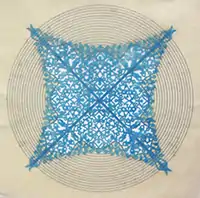 Working from her background in textile and fabric art and design, Agha uses a combination of textile processes such as embroidery, wax, dyes, and silk-screen printing within her drawings and paintings. She creates patterns based on ancient Islamic geometric patterns and Islamic interlace patterns through hand cutting, laser cutting, and sewing on paper. She uses embroidery as a drawing method to bridge the gap between modern materials and historical patterns of traditional oppression and domestic servitude. She questions the gendering of textile work as domesticated and its exclusion of it being considered an art form.[8]