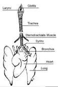 - 1 2 Riede, Tobias; Goller, Franz (2010). "Peripheral mechanisms for vocal production in birds - differences and similarities to human speech and singing". Brain and Language. 115 (1): 69–80. doi:10.1016/j.bandl.2009.11.003. PMC 2896990. PMID 20153887.