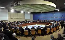 The motto was chosen by the dean of the NATO Council, André de Staercke, to reflect the spirit of consultation envisioned by the then-Secretary General of NATO Paul-Henri Spaak.[1] De Staercke borrowed the quote when he recalled his visit to the Palace of the Chief Magistrate in San Gimignano, where "animus in consulendo liber" was engraved on the Magistrate's seat.[1] The motto is displayed on the wall of the main council room at NATO headquarters in Brussels, behind the chairman's seat.[1]