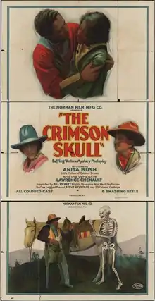 Bush was approached in 1921 by Richard E. Norman, a white filmmaker whose Norman Studios (also known as the Norman Film Manufacturing Company) was among the first companies to produce “race films”—films with positive, family-friendly storylines starring African American characters in positive, non-stereotypical roles.[6] Bush appeared in The Bull-Dogger (1921), starring renowned Black rodeo cowboy Bill Pickett and starred in The Crimson Skull (1922) with vaudeville performer Lawrence Chenault, also with Pickett.[7]