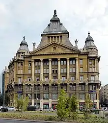 Anker Palace (Hungarian: Anker-palota) is a building in Terézváros, Budapest. It was built by Ignác Alpár in 1908 for a Viennese insurance company, the Anker Life and Pension Company. The building was built in the eclectic style[1] and was completed in 1910. It faces on to Deák Ferenc Square. There are Doric columns on the facade and two statues of women with outstretched arms on the roof.[2]