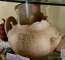 Partially restored alabaster jar with two handles, bearing the cartouches of Tutankhamun and Ankhesenamun, 18th Dynasty, from Gurob, Fayum, Egypt, the Petrie Museum of Egyptian Archaeology, London