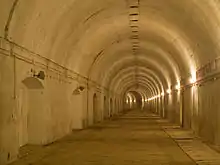 The tunnels were surrounded by barracks, personnel bunkers, and watchtowers. Other buildings were used for operations, administration, and maintenance. Inside each bomb-proof tunnel, there was a rail track and a platform.[3] The tunnel portals were protected by two-wing armoured doors with firing embrasures for the guards.[3] Purpose-built track connected the tunnels with the Rzeszów-Jasło railway.[4]