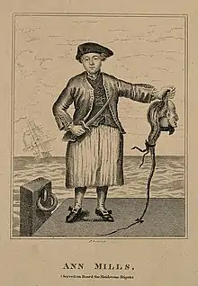 Ann Mills was a British woman who disguised herself as a man in order to become a dragoon. In 1740 she fought on the frigate HMS Maidenstone.