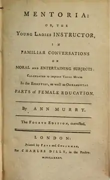 - ↑ Murry, Ann (1785). Mentoria, Or, The Young Ladies Instructor: In Familiar Conversations, on Moral and Entertaining Subjects : Calculated to Improve Young Minds in the Essential, as Well as Ornamental Parts of Female Education. Frys and Couchman.