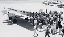 Ann Pellegreno's decision to retrace Earhart's round-the-world flight route in a Lockheed Electra can be traced to the encouragement of her airplane mechanic, Lee Koepke, in 1962.[5] Koepke owned a twin-engine Lockheed Electra 10A that he was restoring at the time, a sistership to that flown by Amelia Earhart on her fateful world flight in 1937.[5] The first article of the historic commemorative event appeared in a Detroit newspaper on March 6, 1967.[6] In April and May of that year the Electra was retrofitted with final fuel equipment for the flight at Javelin Aircraft in Wichita, Kansas.[7] On June 9, she and her crew of three took off from Oakland, California in the plane. Her crew was made up of William L. Polhemus (navigator), William "Bill" R. Payne (co-pilot) and Lee Koepke (owner and restorer of the Electra). The Electra was originally registered in Canada as CF-TCA and re-registered in the U.S. as N79237 when Pellegreno and her crew made their round-the-world flight.[2][6]