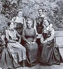 ![]() Marthe and Anna Cartan. Sitting: Madeleine, Marie Curie and Eugénie Cotton. | |