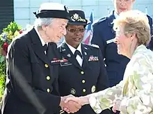 ![]() Navy Master Chief Petty Officer Anna Der-Vartanian (left) shakes hands with Maj. Gen. Jeanne M. Holm, USAF (right). | |