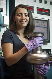 She is known for her pioneering work in superconducting radio frequency cavities for next generation particle accelerators.[1][12] As a postdoc, Grassellino experimented with introducing a small amount of nitrogen into the inner surface of the cavities, which are made of niobium and surface treated using electropolishing.[13][14] She and her group noticed that residual nitrogen remaining in the cavity systematically improved the RF superconductivity response.[4][15] By baking the niobium SRF cavities at high temperatures in the presence of nitrogen, the Q factors more than tripled; dramatically reducing the cryogenic costs of the large accelerator facilities.[13][16] She made the discovery of nitrogen doping by accident, hoping to create niobium nitride but instead found with her FNAL group - via material and surface science studies - that the real effect was due to nitrogen as interstitial.[16] Superconducting radio frequency cavities generate high energy with high current and expel magnetic flux, which can result in power dissipation.[17] The technology has been adopted as the standard for SRF cavities and used in laboratories all over the world, as well as private firms.[4][18] The LCLS-II HE upgrades at SLAC are the first world class accelerator facilities to be built entirely with the nitrogen doping technology. In 2015 she was awarded a $2.5 million Early Career Award from the United States Department of Energy, which allowed her to employ postdocs.[4]