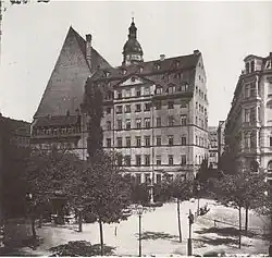 St. Thomas School in Leipzig (photo pre-1885). The Bach family apartment was on the right side, extended over four floors (three floors before the renovation in 1731/32), and was over 2200 square feet in size.[3] The building was pulled down in 1902. (The first Bach monument in the world can be seen in front of the St. Thomas School. It was initiated by Felix Mendelssohn Bartholdy who donated it to the city in 1843. It still survives today.)