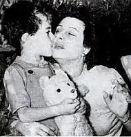 Magnani had a love affair with actor Massimo Serato, by whom she had her only child, a son named Luca,[8] who was born on 29 October 1942 in Rome, after her separation from Alessandrini. At the age of 18 months, Luca contracted polio and subsequently lost the use of his legs due to paralysis. As a result, Magnani spent most of her early earnings for specialists and hospitals. After once seeing a legless war veteran drag himself along the sidewalk, she said, "I realize now that it's worse when they grow up", and resolved to earn enough to "shield him forever from want".[5]