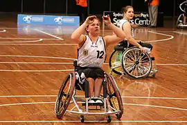 Breuer was part of the German national team which won gold at the 2011 European Championships in Nazareth, Israel, defeating the Netherlands in the final, 48–42.[11][12] In June 2012 she was named as one of the team that competed at the 2012 Summer Paralympic Games in London.[11] In the Gold Medal match, the team faced the Australia women's national wheelchair basketball team,[13] a team that had defeated them 48–46 in Sydney just a few months before.[14] They defeated the Australians 44–58 in front of a crowd of over 12,000 at the North Greenwich Arena to win the gold medal,[13] They were awarded another Silver Laurel Leaf by President Joachim Gauck in November 2012,[15] and were again named Team of the Year for 2012.[16] In a ceremony in Ulm, Breuer was congratulated by the Lord Mayor, Ivo Gönner, and her name was entered in the Golden Book of the city.[17] In December 2012, it was announced that in addition to playing for second division Sabres Ulm, she would also play for five-time Champions League winning first division club RSV Lahn-Dill in 2013.[18]