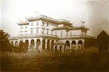 ![]() Front facade of the main house. Two human figures under the far left arch of the front porch give an indication of scale. | |