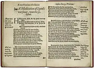 A Meditation of a Penitent Sinner is one work in a long tradition of poetic meditation on the Psalms. The sequence develops the penitential poetic mode that was also used by late medieval poets.[23] While both Catholics and Protestants composed poetry in the penitential tradition, Protestant reformers were particularly drawn to Psalm 51 because its emphasis on faith over works favoured their reformist theology.[24][25]