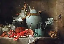 In 1817 she exhibited Still Life with Lobster in the Paris Salon.[12] In this, her last exhibited painting, she managed what an expert called "a summation of her career"[1] depicting most of her previous subjects together in a work she donated to the restored King Louis XVIII. There is some evidence that Vallayer-Coster gave it to the king as an expression of her joy as a loyal Bourbon supporter through the turbulent years of the Revolution and Napoleonic imperialism.[12]