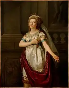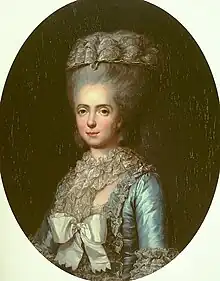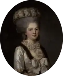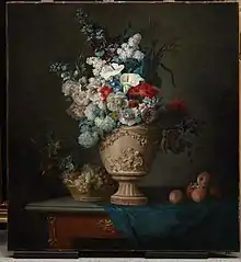 Vallayer-Coster exhibited her first floral still life in 1775, and subsequently became known especially as a painter of flowers.[9] Four years later, she began to enjoy the patronage of Marie Antoinette.[10] With her Court connections and pressure from Marie Antoinette, she received space in the Louvre in 1781 which was unusual for women artists.[10] Shortly thereafter, in the presence of Marie Antoinette at the courts of Versailles, she married Jean-Pierre Silvestre Coster (1745—1824), a wealthy lawyer, parlementaire, and respected member of a powerful family from Lorraine. Marie Antoinette signed the marriage contract as witness.[7][10] With these titles came the very highest ranks of the bourgeoisies, the noblesse de robe. With such a prestigious title came a state office which, traditionally during this time was bought from father to son, making them almost indistinguishable from the old nobility.[10]