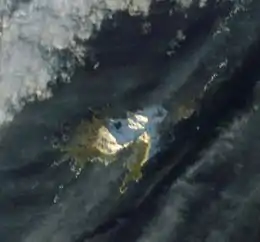 On the eastern arm of the island is a tussock-covered ridge called Albatross Crest, named for the wandering albatross (Diomedea exulans) which nests here.[11] On the north coast of the eastern tip of the island, Spilite Arch is a sea-worn arch formed by a pillar of rock 30 m (98 ft) high joined to the coastal cliffs by a spilite sill.[12]