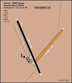 - ↑ "Distance and heading from Metlakatla to ANN". Great Circle Mapper. Retrieved 5 August 2010.