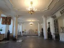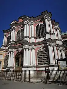 The ground floor housed the Annunciation Church, consecrated on 25 March 1725 by Archbishop Theodosius.[1][2] The alabaster details and iconostasis was by Ivan Adolsky, Ivan Nikitin and Dmitry Solovyov.[4] Carvings were done by skilled workmen from the admiralty. Massive composite columns supported a flat ceiling with the plafond “Name of God” by Adolsky and M. L. Negrubov.[4] The interior was illuminated with a silver chandelier, donated by Prince Alexander Danilovich Menshikov.[4] A crypt under the church was prepared in 1720, and a two-story staircase pavilion was added to the western facade of the church between 1764 and 1765, to the design of Mikhail Rastorguev.[4] A further extension was built in 1783, along the south-eastern part of the church, which came to house the family monuments of several noble houses, including the Shuvalovs, Betskoys, Vyazemskys and Naryshkins.[2] A small sacristy was attached to the eastern side of the church, which later housed the Yusupov family's monuments.[2]