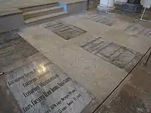 Those with close connections to the imperial court were also buried here. Among them were courtiers Yevdokiya Yusupova, Anastasiya Trubetskaya, and Anna Matyushkina; as well as Alexei Razumovsky, lover and rumoured husband of Empress Elizabeth; and Maria Rumyantseva, mistress of Peter the Great.[1][6] Members of several important noble families were also buried here, including the Shuvalovs, Betskoys, Vyazemskys, Naryshkins, and Yusupovs. On 12 May 1800 the hero of the French Revolutionary Wars Generalissimo Alexander Suvorov was buried in the church, under a white marble slab with the simple inscription, chosen by the Generalissimo himself, "Here lies Suvorov".[1][2]