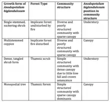 Anodopetalum biglandulosum has a flexible growth form. There are four main classifications of growth form: single stemmed and suckering shrub, multi-stemmed coppice, tangled shrub and monopodial tree.[9] Variation in growth form is due to forest type, community structure and the degree of disturbance.[9] Simple representation of the growth forms associated with Anodopetalum biglandulosum are shown in Table 1.