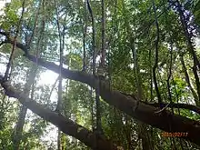 Anodopetalum biglandulosum is commonly known as horizontal scrub due to the habit of its slender trunk (primary shoot) bending down horizontally under its own weight. This fallen stem sends vertical branches up its length (secondary shoots), which in turn bend down and branches arise (tertiary shoots), forming an impenetrable horizontal scrub.[5] The creation of light gaps in the canopy changes light intensity, causing dormant buds at the branch nodes to overcome apical dominance and produce secondary and tertiary shoots.[6] Vegetative reproduction is the main mode of regeneration in Anodopetalum biglandulosum. The species is commonly less than 8m in height but can grow up to 12m tall in deep soiled, sheltered gullies.[2]