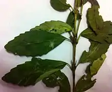 The leaves are opposite and unifoliolate. The leaves are bright green, narrow elliptical to ovate in shape, (5-15mm wide) and (15-60mm long), end with a blunt point and have coarsely serrated margins.[5]