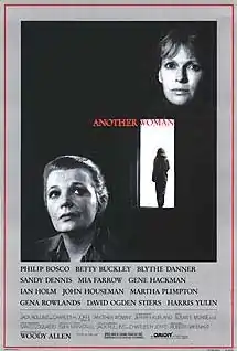 Another Woman is a 1988 American drama film written and directed by Woody Allen. It stars Gena Rowlands as a philosophy professor who accidentally overhears the private analysis of a stranger, and finds the woman's regrets and despair awaken something personal in her.