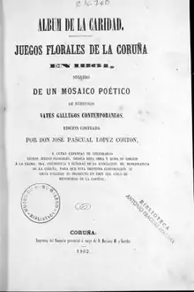 - ↑ Album de la Caridad. Juegos Florales de La Coruña en 1861, seguido de un mosaico poético de nuestros vates gallegos contempornáneos Galiciana. Biblioteca de Galicia.