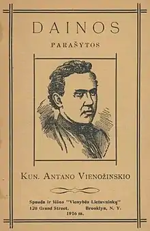 Vienažindys started writing poetry as a student at the priest seminary, but his first poem was published only in 1873.[27] Polish ethnographer Edward Chłopicki in his article about his journey through Lithuania published in the weekly magazine Kłosy included a Polish translation of one poem by Vienažindys.[26] Several poems sometimes attributed to Vienažindys were published in Lithuanian periodicals Varpas, Ūkininkas, and Vienybė lietuvninkų in late 1891 to 1893. At the time, Vienažindys was already terminally ill and the poems were signed by pen name Žemaituks (Samogitian) which was used to sign other poems as well.[27] The first poetry collection was published in Plymouth, Pennsylvania, in 1894 by Juozapas Žebrys, vicar of Akmenė and Vienažindys' friend, who emigrated to the United States.[27] Since then, his poetry was included in many different collections, anthologies, chrestomathies.[28] One stanza in original Lithuanian was included in The Jungle, a 1906 novel by Upton Sinclair.[29] His poetry and surviving letters were published in Vilnius in 1978.[30]