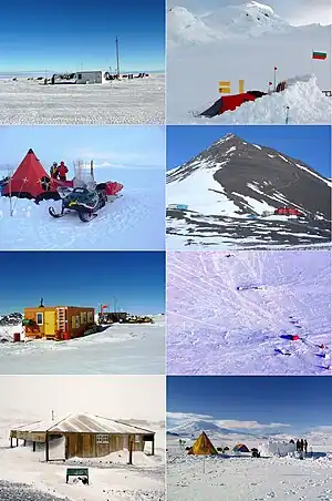 Antarctic field camps. Clockwise: Patriot Hills, Academia, Fossil Bluff, Sky Blu, Erebus, Scott's Hut, Lower Erebus, Casanovas.