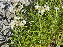 Antennaria lanata is a small herb up to 20 cm (8 inches) tall. Leaves are covered with thick white hairs resembling wool. It is dioecious, meaning that male and female flowers are borne on separate plants. It grows in protected alpine and subalpine sites in mountainous areas.[2]